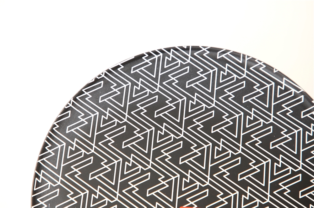 総柄のグラフィックを落とし込んだモノトーンの天板がクールな〈TABLE O〉。上記のチェアと組み合わせて使うことで、シックな大人のキャンプサイトが完成する。