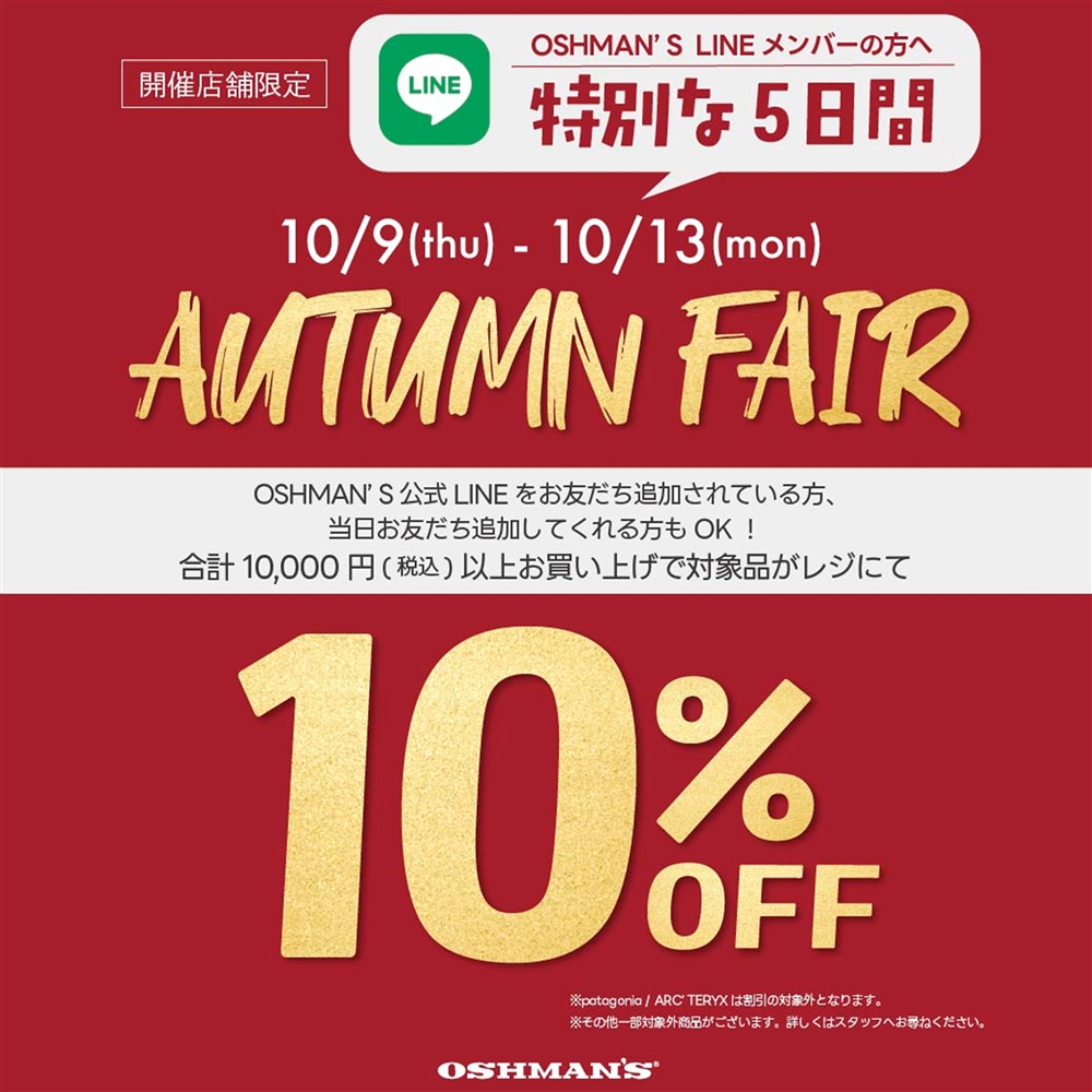 10月9日(木)~13日(月・祝)の期間、LINEメンバーさま(新規追加の方含む)対象で、「10,000円以上お買い上げで "10%OFF"」となる『特別な5日間!AUTUMN FAIR』を開催いたします。