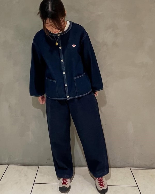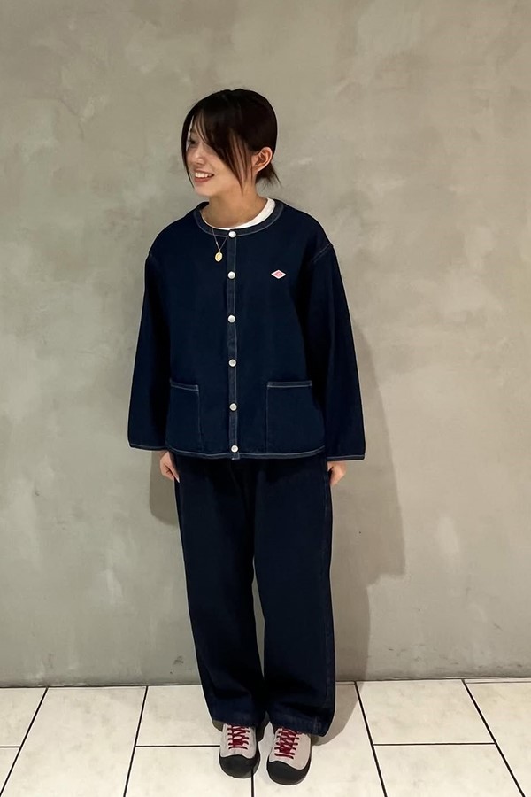 軽量デニム×ゆったりシルエットで、カジュアルながら上品に決まるノーカラージャケット。