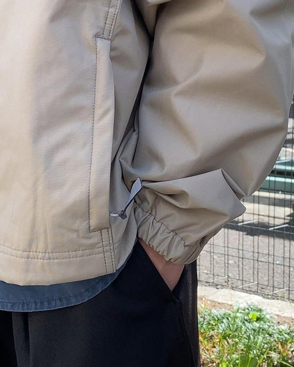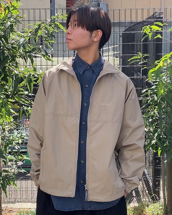 「Gramicci for OSHMAN’S」別注のスタンドカラージャケット。裏地にメッシュを配した軽量ウィンド仕様で、ラグランスリーブにより肩周りの動きも快適。両サイドポケットと肘の共地パッチが機能性とデザイン性を両立。カジュアルからきれいめまで幅広いパンツと相性がよく、長いシーズン活躍する汎用性の高い一枚です。
