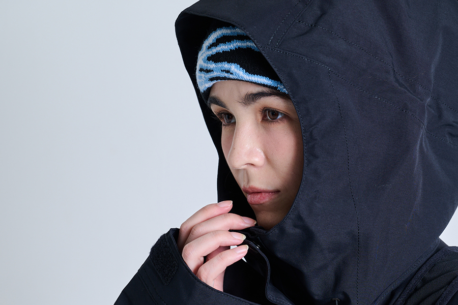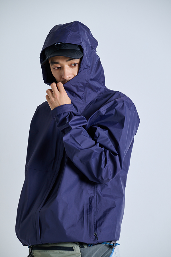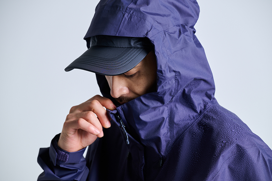 撥水・リップストップ素材で軽やか、フード・裾のスピンドルで調整可能なショートジャケット。