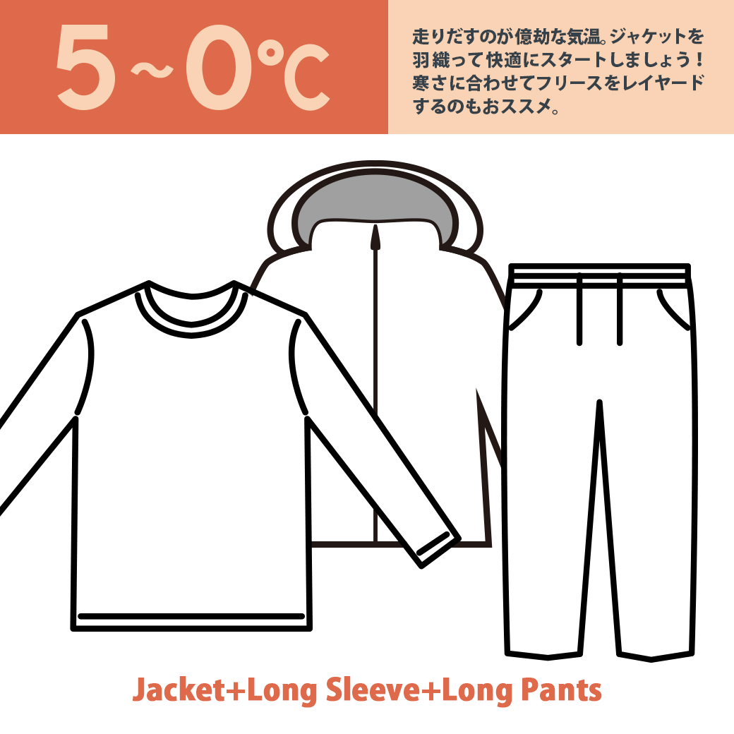 冬の寒さにも負けず走りだそう! スタッフがおススメする冬のランニングスタイルを気温別にご紹介します。 ポイントは、気温に合わせ上手にレイヤードしていくのがおススメです。 それぞれの気温帯のバナーをクリックすると、おすすめ商品の一覧がご覧いただけます。