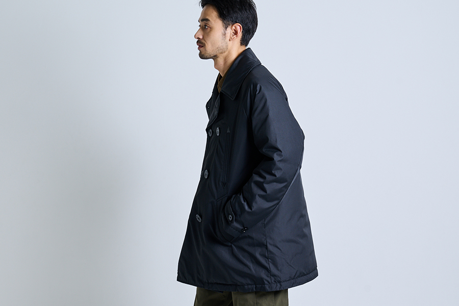 ピーコートらしい錨ボタンやポケットなどのディテールは