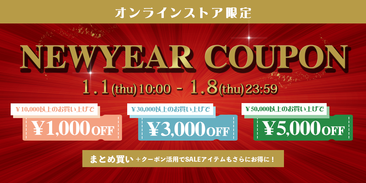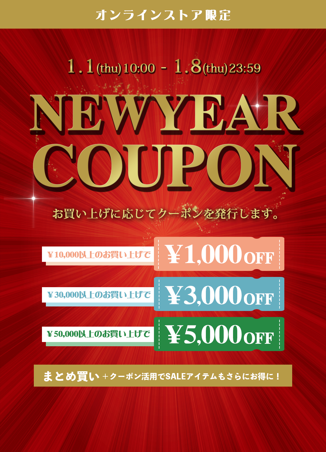 「NEW YEAR COUPON」を活用して、まとめ買い+SALEアイテムもさらにお得に! 今から活躍する、今季アイテムが多数ラインナップ! ぜひ、お早めにチェックしてください。