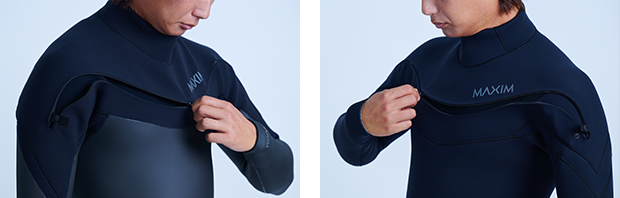 独自に開発した革新的ファスナー構造のハイブリッドU-ZIPは、胸元にストレッチロングファスナーをU字型にレイアウトすることで、