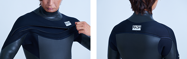 インナーシールドシステムにハイネック(内側に折込タイプ)を標準装備とすることで、首からの浸水を大幅に軽減しました。